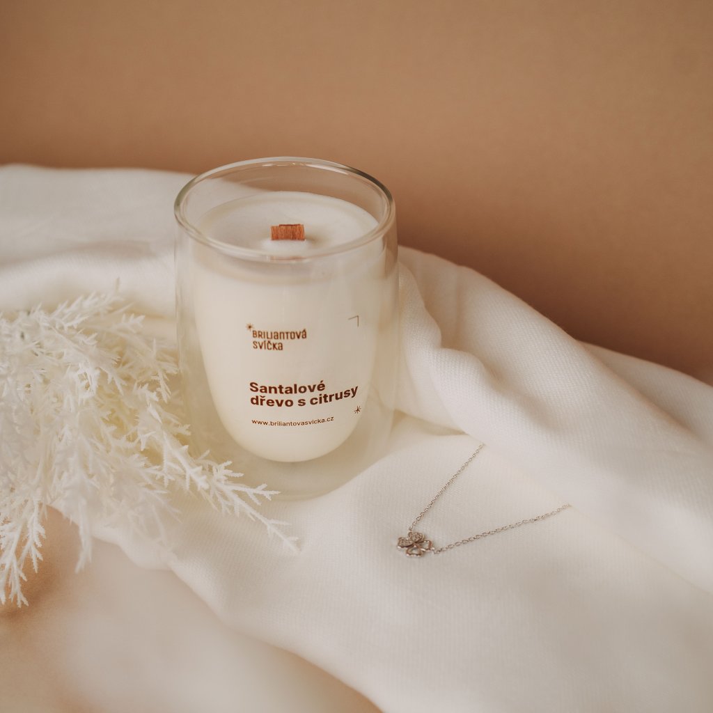 Svíčka Santalové dřevo s citrusy & Stříbrný náhrdelník Čtyřlístek (M)